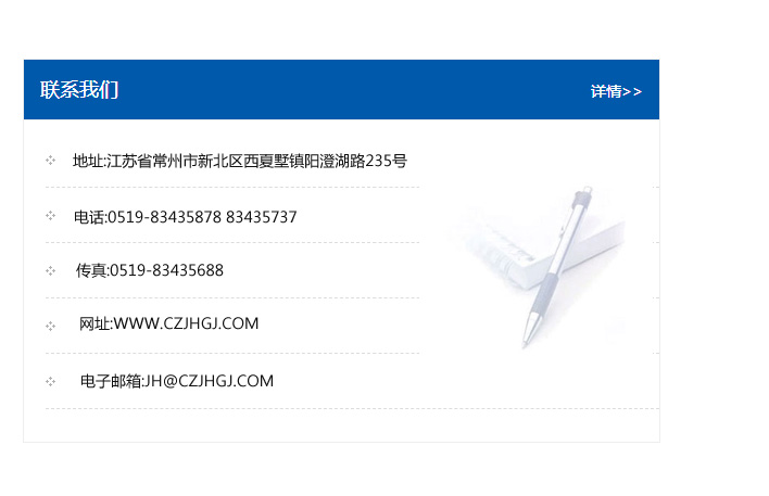 地址:常州市新北區(qū)友邦商務(wù)大廈1幢16、17層  電話:0519-85101652  傳真:0519-85112595  郵編:213022  網(wǎng)址:www.cz-jiayue_cn.crexic.com  郵箱:xiajifengaa@163.com